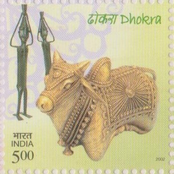 • Dhokra is a metal craft practiced by the indigenous people of Chhattisgarh, Orissa and West Bengal. The “lost wax” technique is at the heart of this art. The creation is given concrete shape with the craftsperson’s experience and expert hands. The creation has to undergo twelve stages of work and uses a multiplicity of clays and tools before coming to the final shape. The wax and mud mould can be used only once in this type of creation. The method of work at every stage is very important.