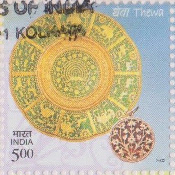 • Thewa work is a traditional art practiced in Rajasthan, which is meenakari ornamentation in gold done on the surface of coloured glass. To concretise this art, first the desired design is prepared on thin leaves of gold. After doing grating etc., the glass is moulded by a chemical and heating process. Silver frame then is made and mounted with gold polish. The golden design made on glass is then studded in a polished frame.