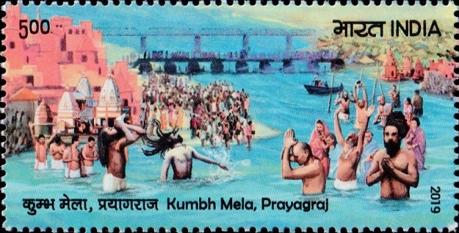 A commemorative postage stamp on the Prayag Kumbh Mela, a mela held every 12 years at Prayagraj, Uttar Pradesh, India :