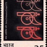 Description of Design : The stamp shows the Sappers in the uniform of 1780 and 1980 together with the crest and the ribbon of the corps of Engineers of the Indian Army.